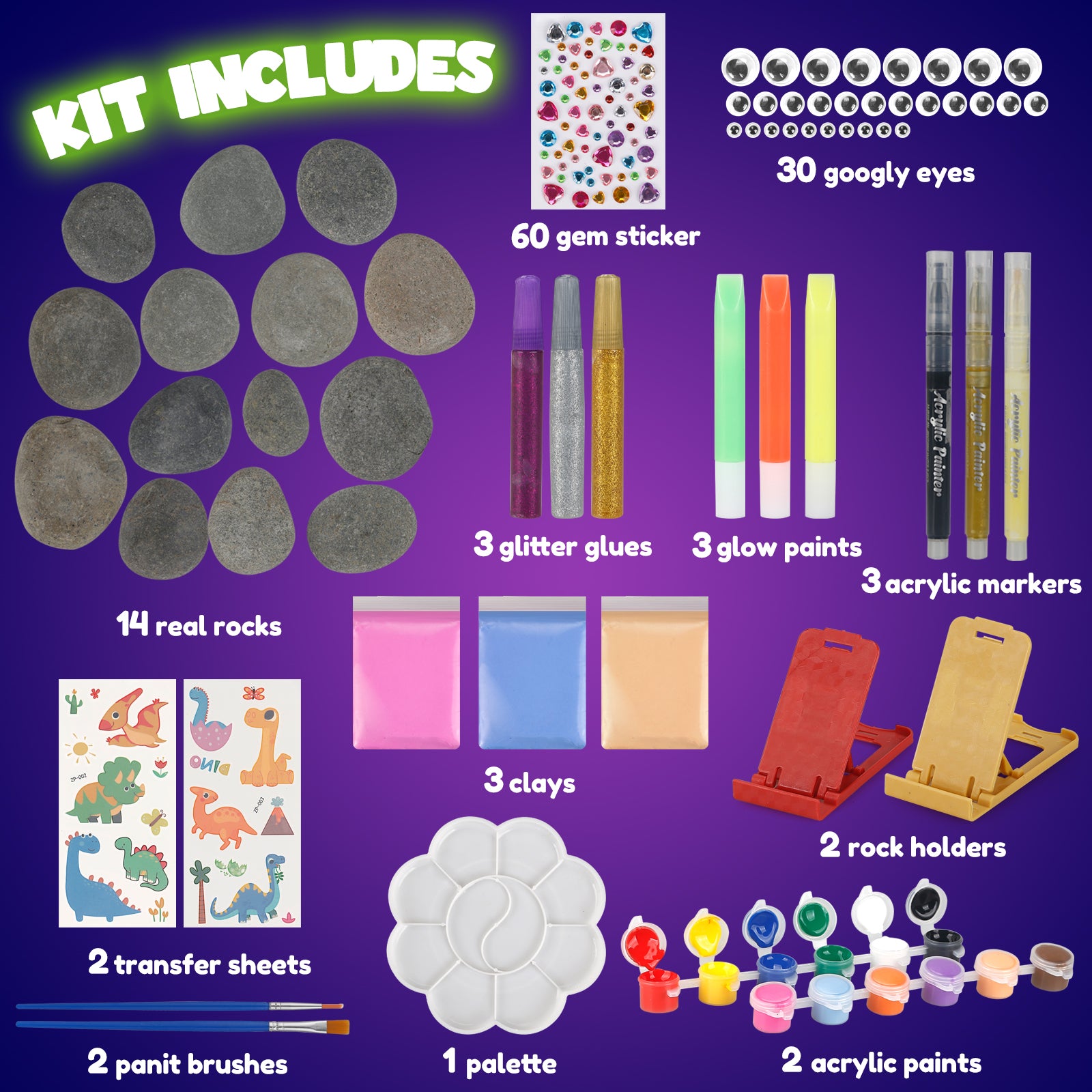 - Super Value Pack: This DIY craft rock coloring kit includes 14 real rocks, 3 acrylic paint markers, 3 glow-in-the-dark paints, 2 transfer stickers, 60 gemstone stickers, 30 googly eyes, 3 glitter glues, 2 sets of acrylic paints, a color palette, 2 paint brushes, 3 packages of clay and 2 rock holders.