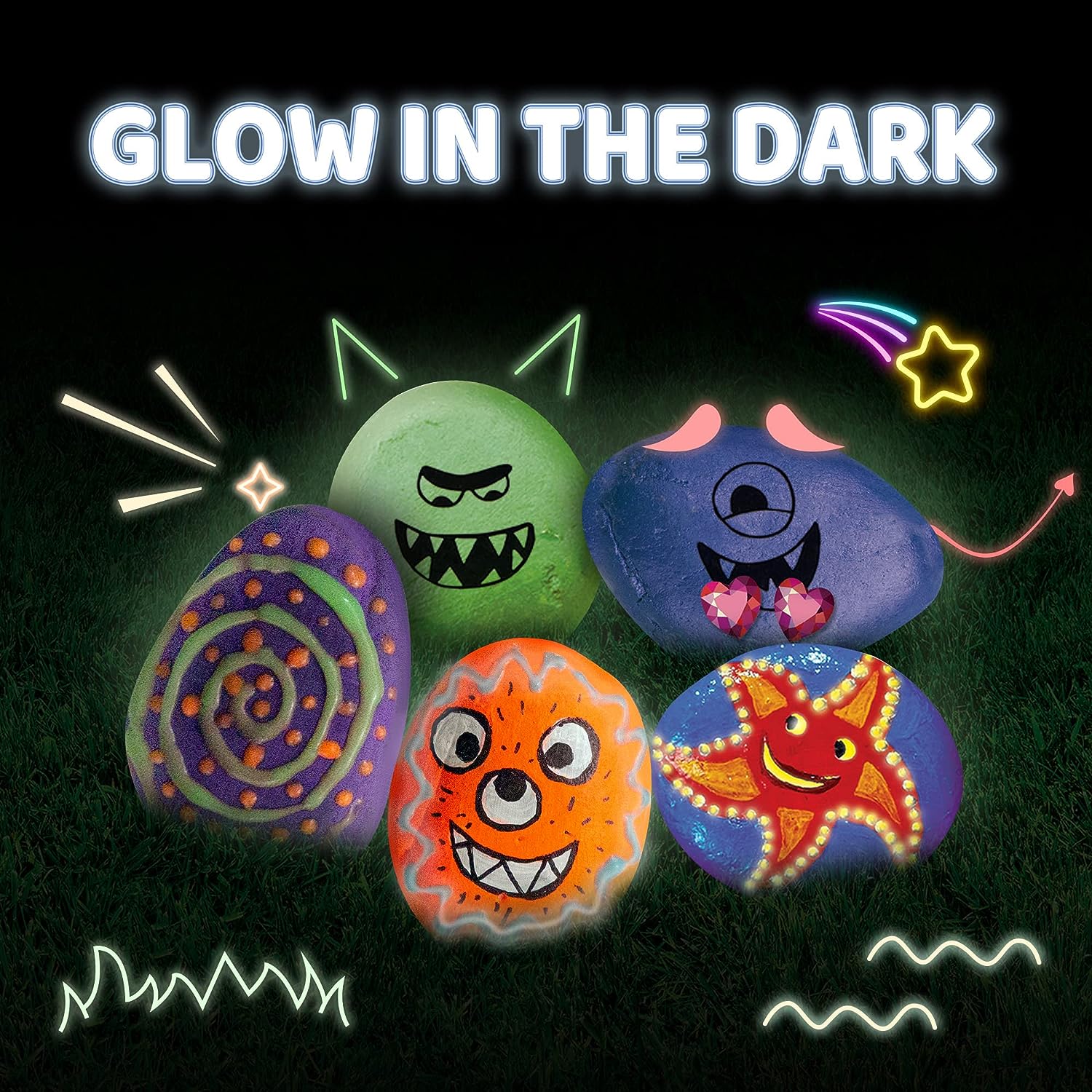 - Fun & Easy: The main attraction is the puffy glow-in-the-dark paints. When the lights go out, these paints will light up and provide beautiful designs. Whether you're a beginner or an experienced rock painter, the Glow-in-the-Dark Rock Painting Kit has something for you. With a variety of tools to match, cute and eye-catching cartoon stickers, and glitter drills, kids can get creative and add a personal touch to their rocks.