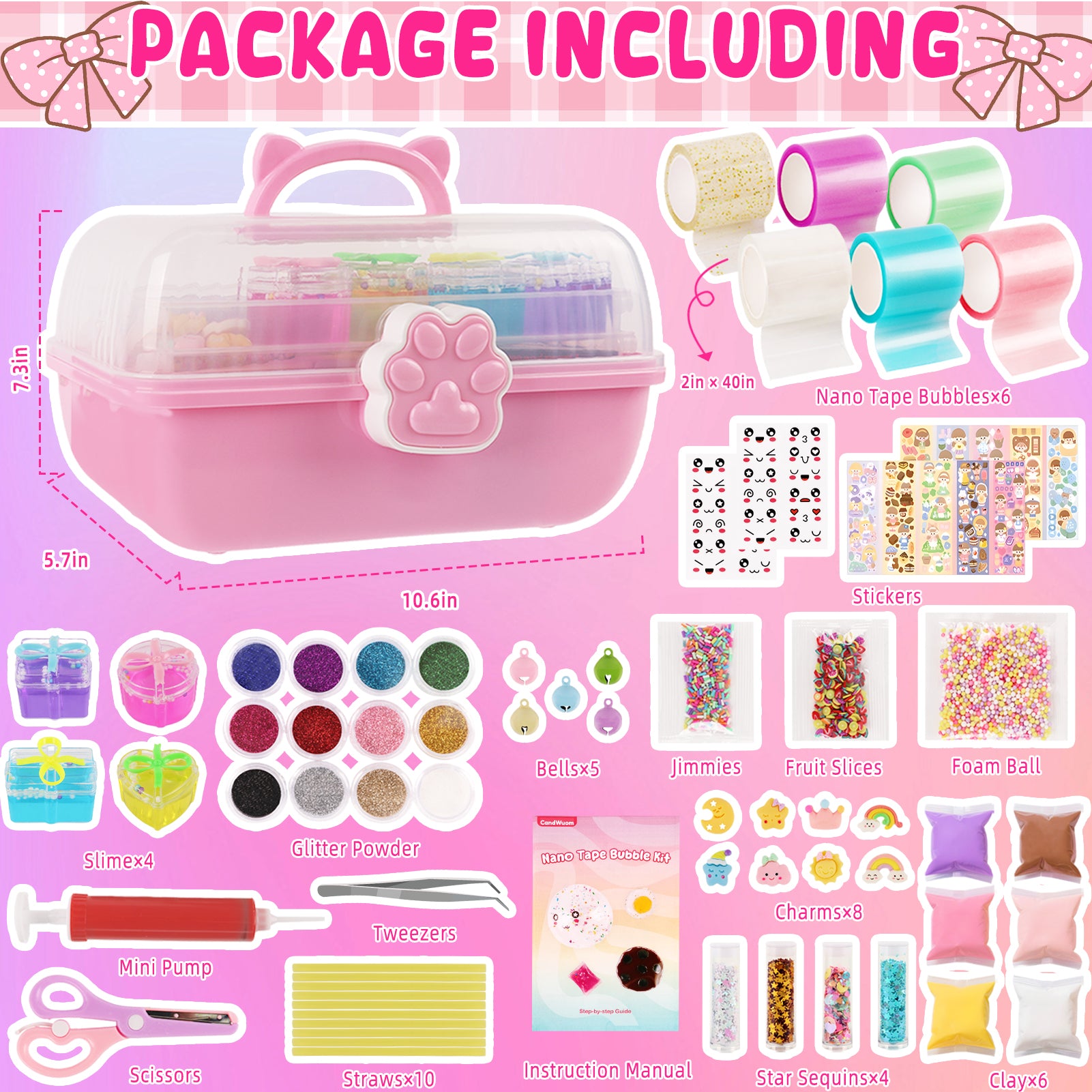 - Complete Accessories: 6*Nano Tape Bubbles (1.97in*39.37 in), 6*Clay, 4*Slime, 4*Star Sequins, 10*Straws, 8*Charms, 5*Bells, Foam Ball, Glitter Powder, Mini Pump, Jimmies, Fruit Slices, Tweezers, Stickers, Scissors. Enough quantity to meet your needs, you can share it with friends.