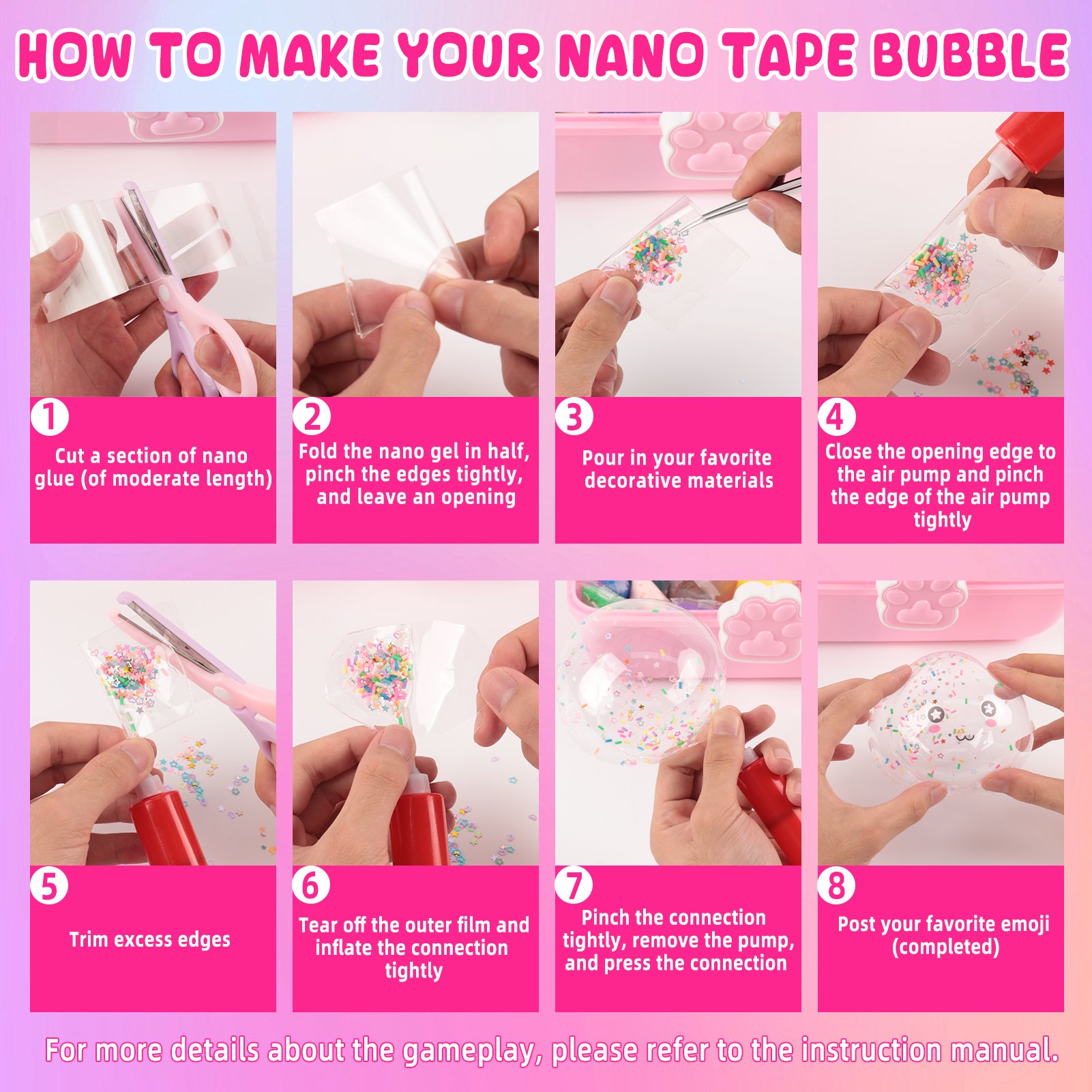 - Detailed Operation Guide: Our nano tape bubble kit includes a variety of materials, allowing for diverse and creative ways to play. It comes with clear, easy-to-follow instructions that carefully outline each step of the process. Children can easily follow along and enjoy the fun of creating their own bubble creations.