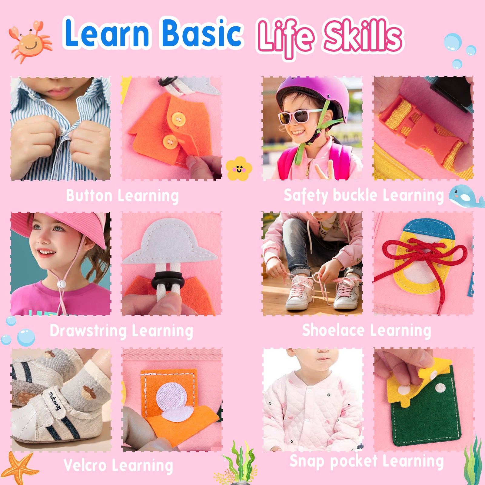 - 8 Pages in 1 Montessori Busy Board: This pink Mermaid busy book has 8 activity pages and contains multiple learning activities in the basic dress skills, letters, numbers, shapes, colors, matching animals, and mermaid themed puzzle game, keeping your little ones engaged for a long time!